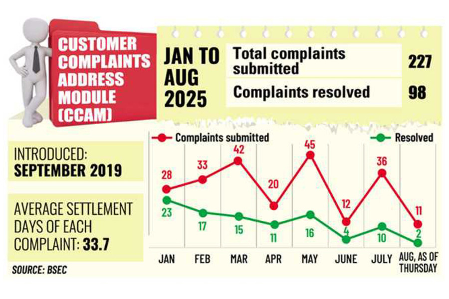 According to data from the Bangladesh Securities and Exchange Commission (BSEC), investors filed a total of 227 complaints through the CCAM between January and mid-August. Of these, 98 complaints have already been resolved, while 129 are currently under process.