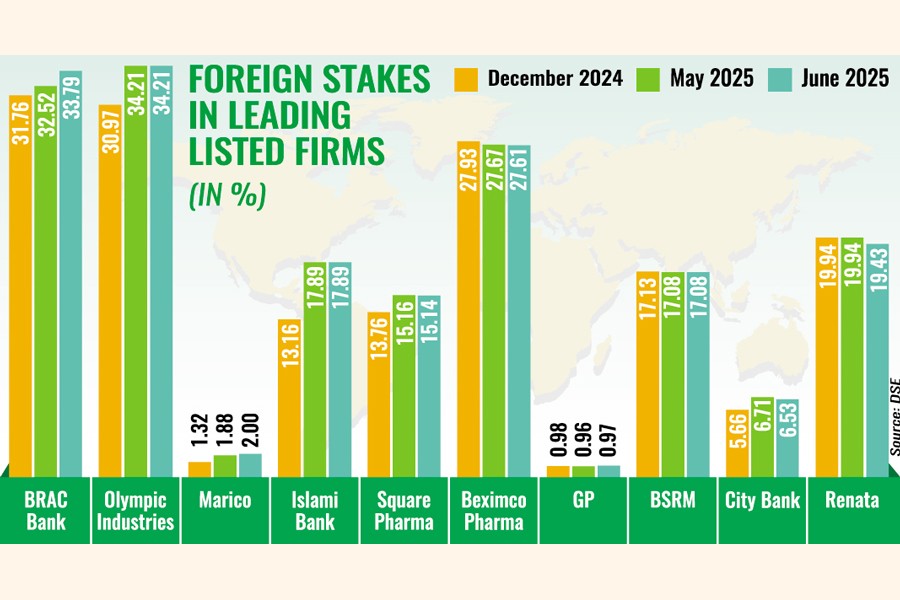 BRAC Bank, the largest private commercial bank in terms of profitability, witnessed its foreign stake increase from 31.76 per cent in December last year to 33.79 per cent in June this year.