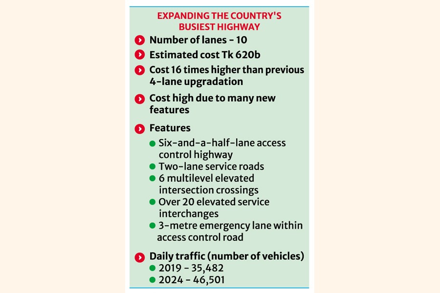 Officials said though the cost is lower than the earlier estimate of Tk 732 billion made by the Roads and Highways Department (RHD) by totalling the demands of its zonal offices, it is still high due to accommodating many new features into the busiest corridor of the country.