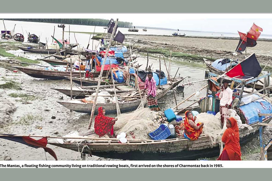 Often categorised as Bedes, the Mantas are in fact a floating fishing community mostly living in Bangladesh's southwestern coastal areas, including Barishal, Bhola, and Patuakhali. Their total number is estimated at 0.25-3.0 million. The majority of them have the same story - their forefathers were compelled to adopt the full-fledged boat life after riverbank erosion had devoured whatever land they owned or lived on.